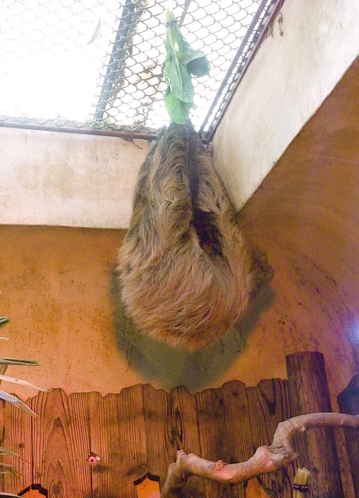 ↑ フタユビナマケモノ。天井の網に、弧を描いた頑丈な爪をフックして微睡んでいます。