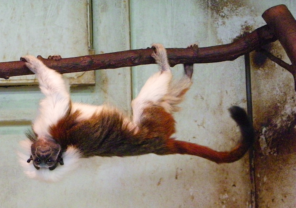↑ ワタボウシタマリン。体重は1kgにも満たない小型のサルです。
