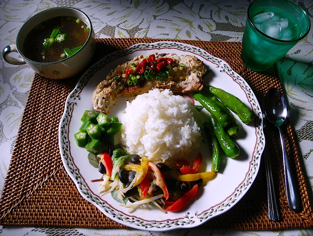 ・パプリカ、オクラ、舞茸、コンブ等を入れてテキトーに作ったスープ