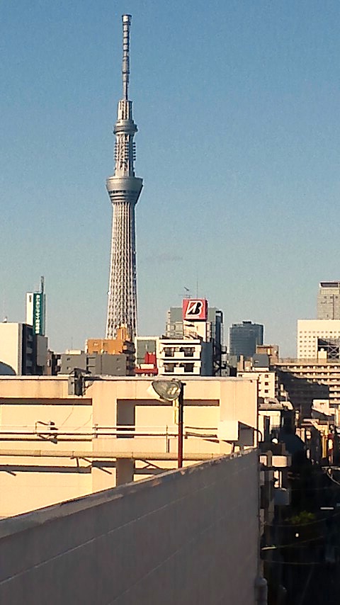 裏道から見た景色。下町の家並とは対照的な高層ビルが夕陽に輝いていて、ちょっと印象的な光景でした。