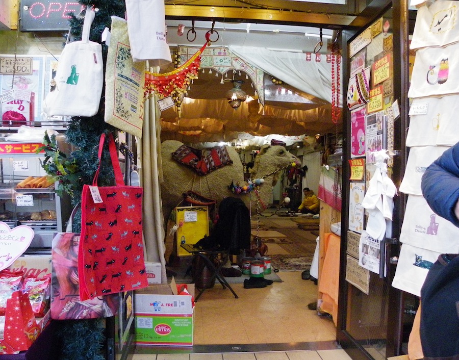 奥が広くて、遊牧民のテントの中みたいな感じのお店。椅子やテーブルが無くて、敷物を敷いた床に座るみたい。何屋さんだろう。