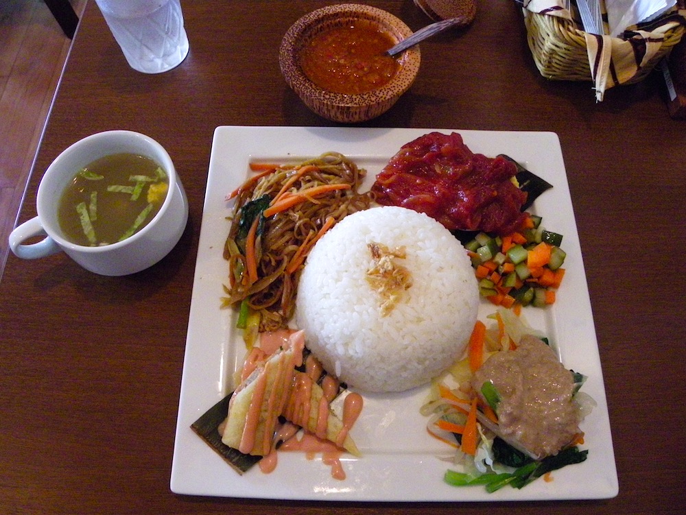 おかずは、トマトソースがけの茹で卵、アチャール(あっさりした野菜の酢の物)、ガドガド(温野菜サラダ)、ルンピア(春巻)、ミーゴレン(焼そば)。