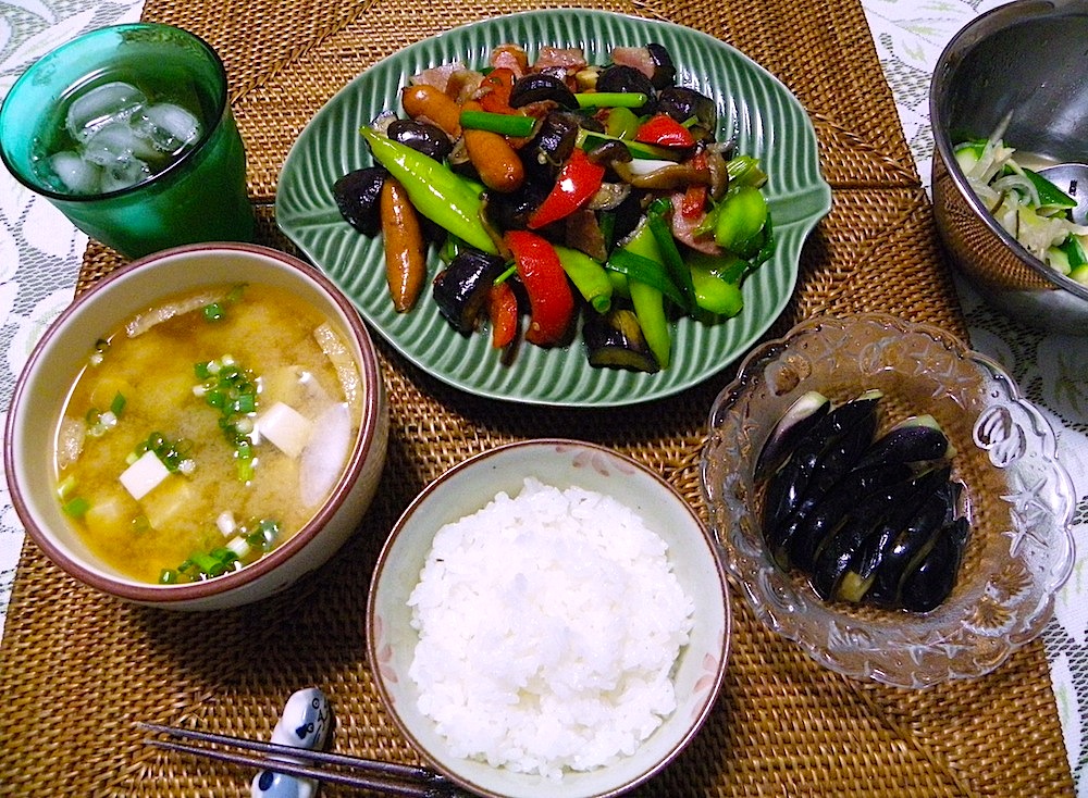 夏野菜の炒め物は、茄子だけ先にサッと炒めて取り出して、