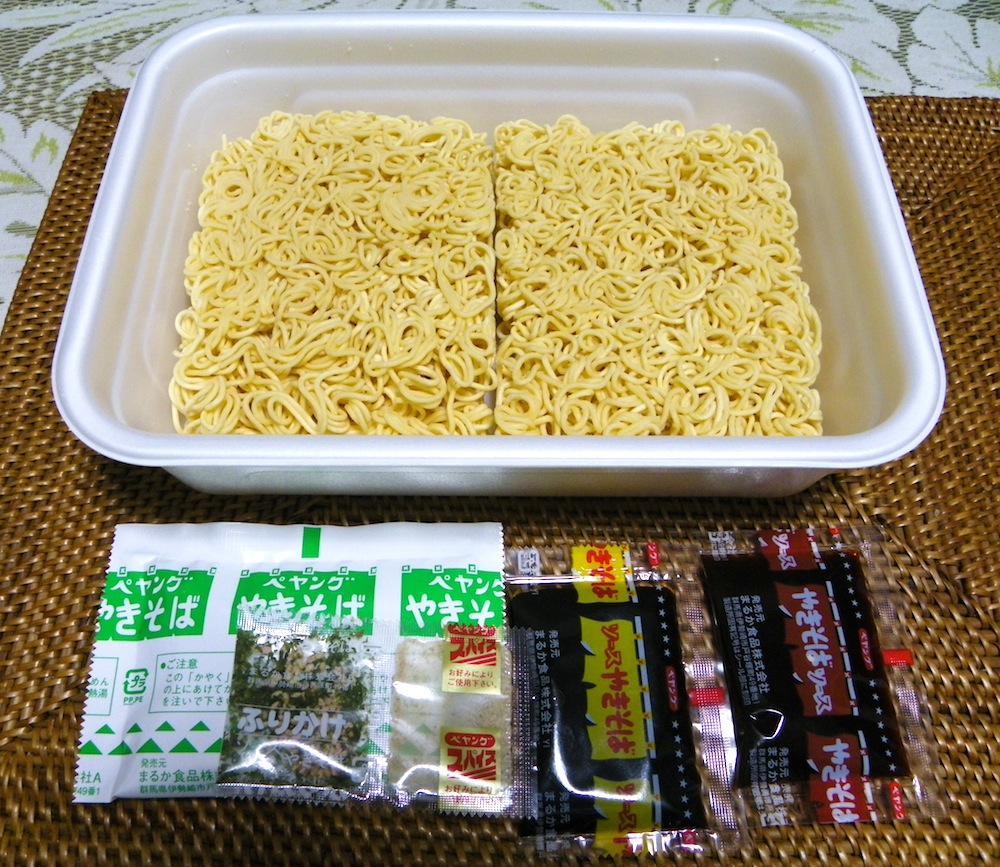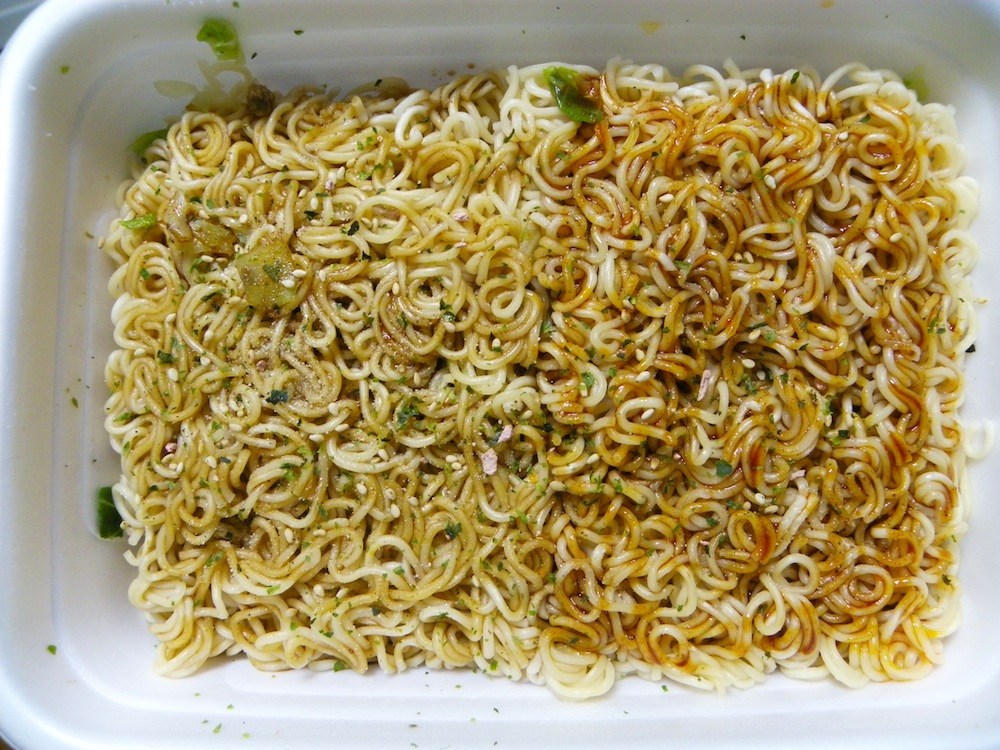 麺とかやくを混ぜ合わせ、左右それぞれ違うタイプのソースをかけました。