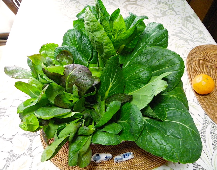 庭で穫れた小松菜とレタス系のサラダの葉っぱ。