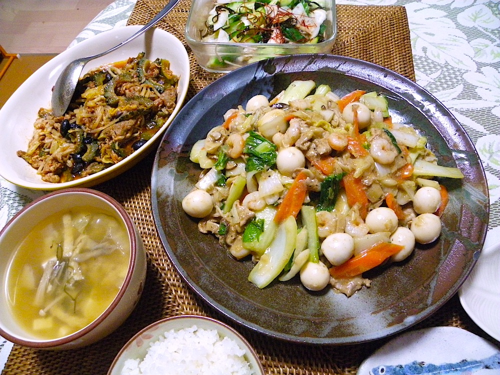 八宝菜、ゴーヤーのトマトソース和え、里芋と茸とメカブの味噌汁、蕪と胡瓜と生姜の梅塩揉み、炊きたてのご飯。