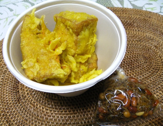 イダナさんの屋台に、カミさんお気に入りのタフ・イシ(「豆腐・中身」...豆腐をくりぬいて、鶏挽肉と野菜をつめて揚げたもの)が4つ残っていたので、全部引き受けようかと思ったら、カップに入り切らないとかで3コ。
