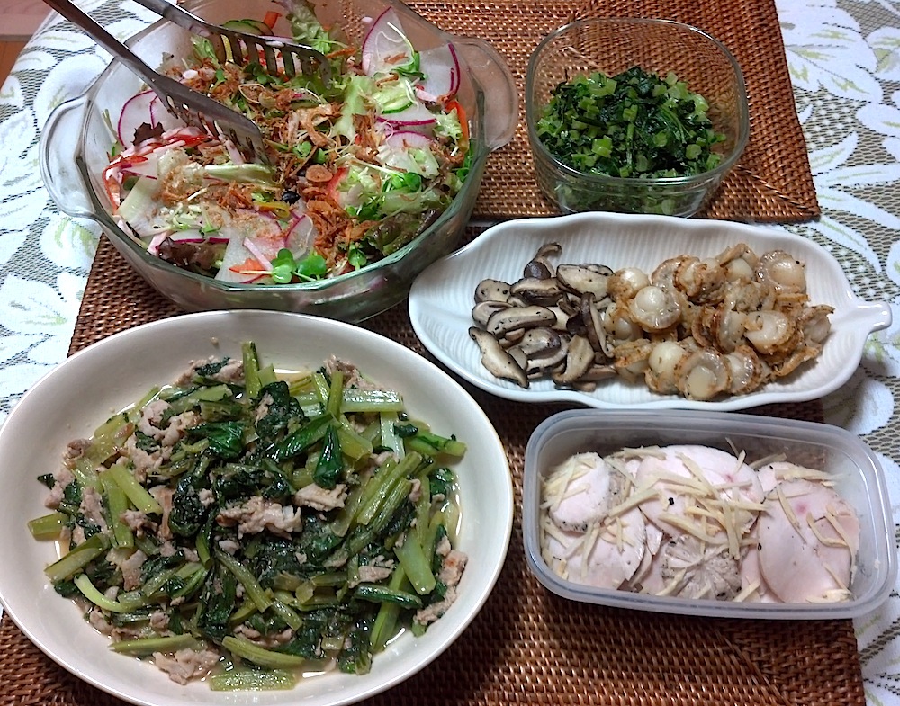 ・小松菜、豚肉、梅干の炒め物。どシンプルだけど、ウチでは人気のおかず。