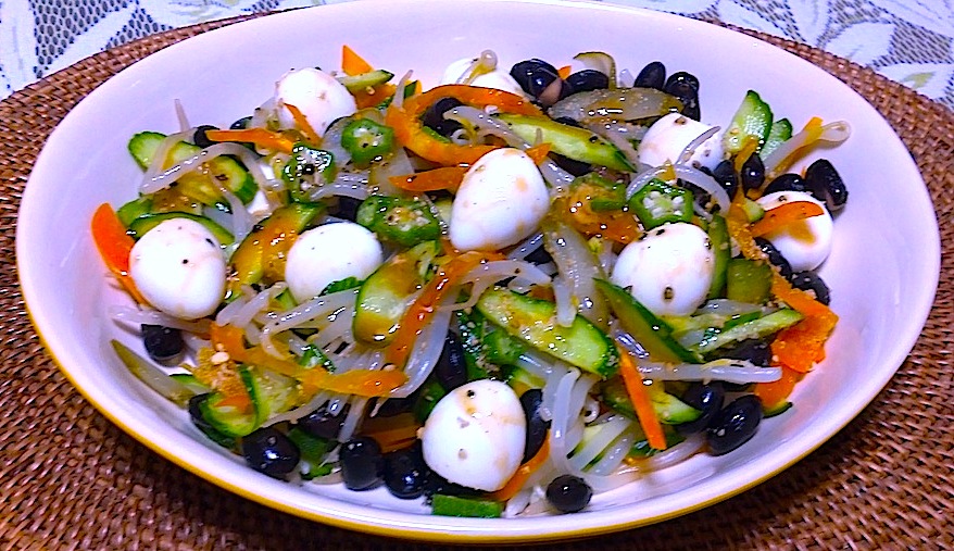 具は、ウズラの卵、きゅうり、きゅうりのピクルス、軽く塩茹でしたモヤシとオクラ、黒豆、オレンジのパプリカ、すり胡麻