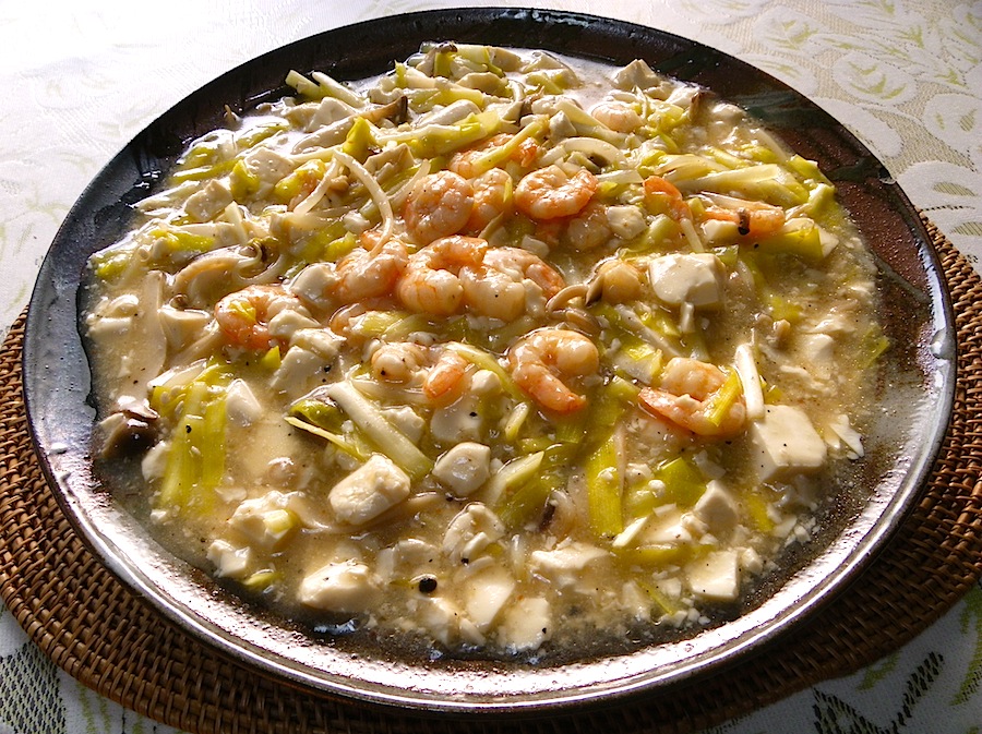 材料:黄金ニラ、海老、椎茸、しめじ、エリンギ、絹豆腐、生姜、塩、胡椒、甜菜糖、レモン汁、チキンのスープストック、片栗粉、油