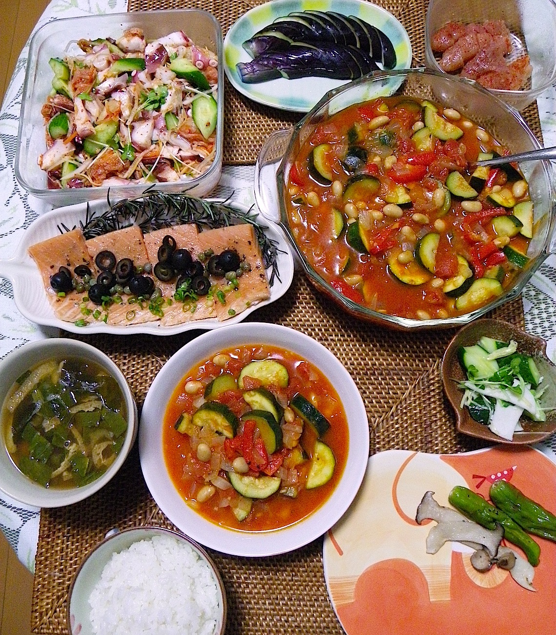 これらの他に、カミさんの好物のアボカドサラダも作って冷やしておいたのに、並べ忘れた〜。