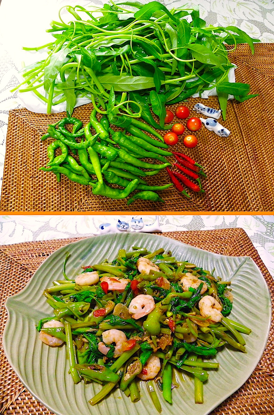 カンクンを主役に、プチトマト、ニンニク、バワンメラ、辛くない唐辛子の伏見甘長やライムホルンなどを合わせて炒めました。