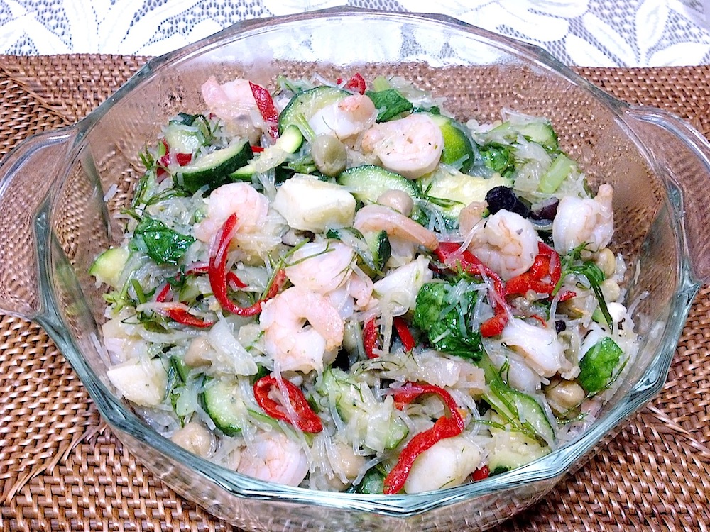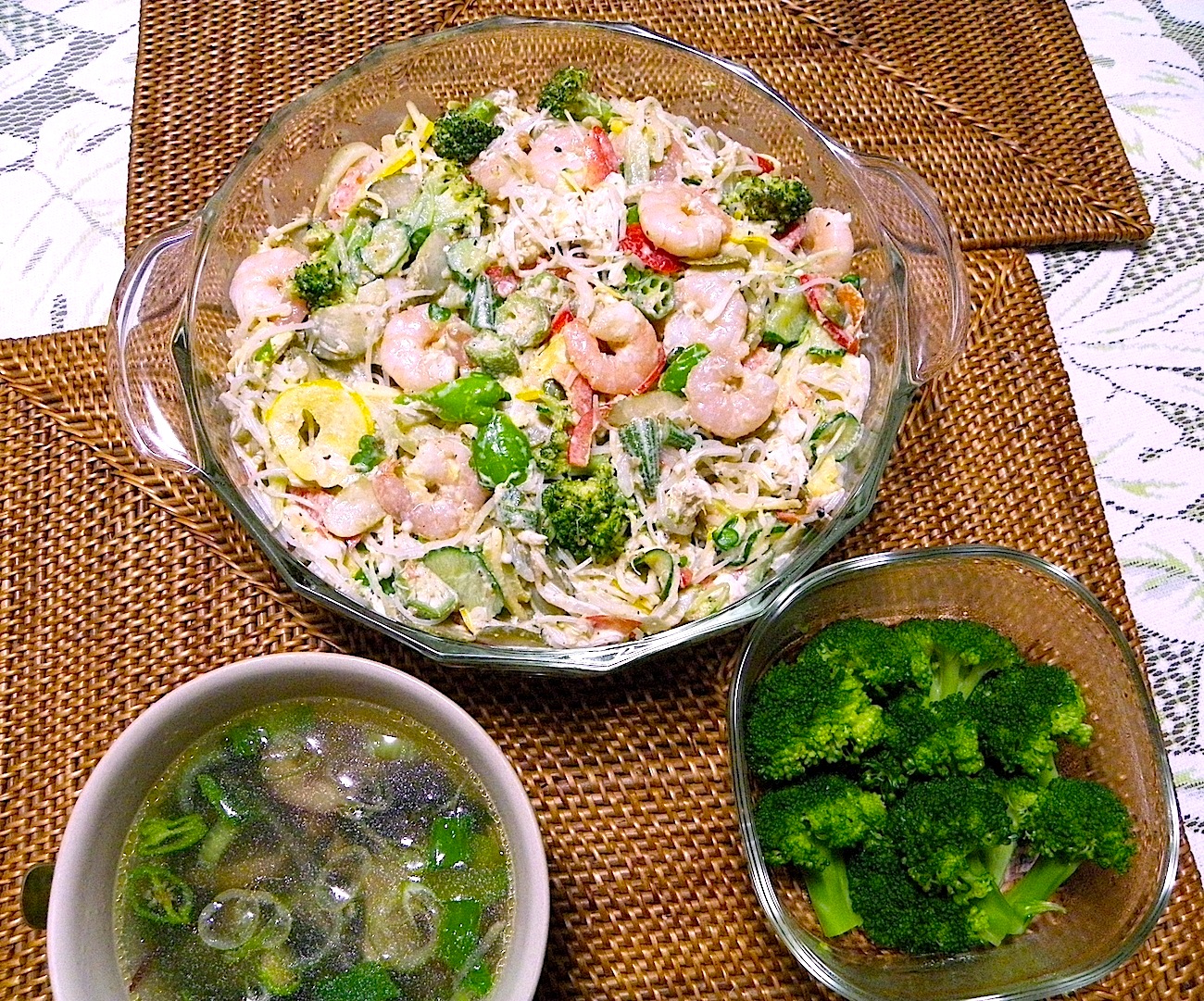 ズッキーニ、海老、小松菜、豆、唐辛子、パプリカ、ジャガイモ、春雨のおかず。