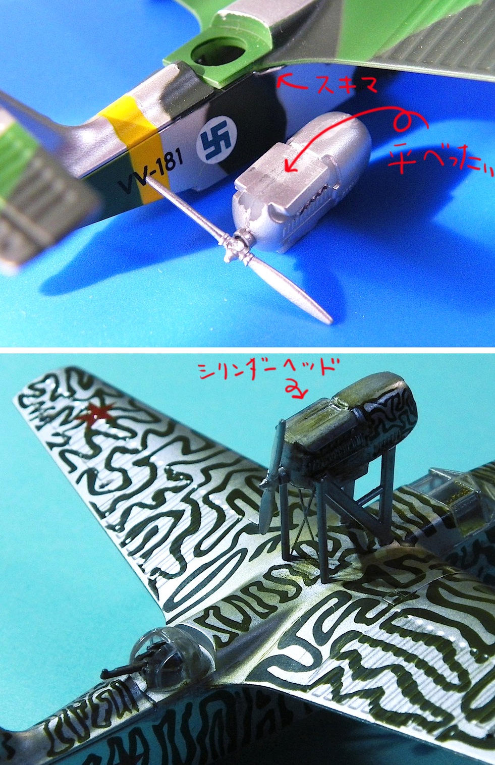各所の合いの悪い隙間も、なるべく埋めました。そうすると地色の銀と迷彩を塗り直しですね。