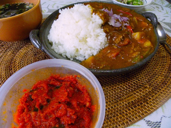 赤いのはインドネシアのチリソース「サンバル」。好みでカレーに加えます。