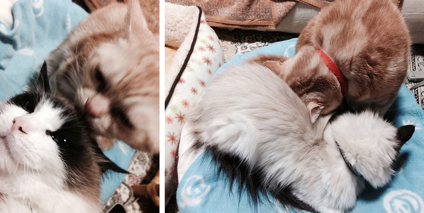 にゃんこは、ヒトのモフモフした服や同僚にゃんこの毛に顔を突っ込む。