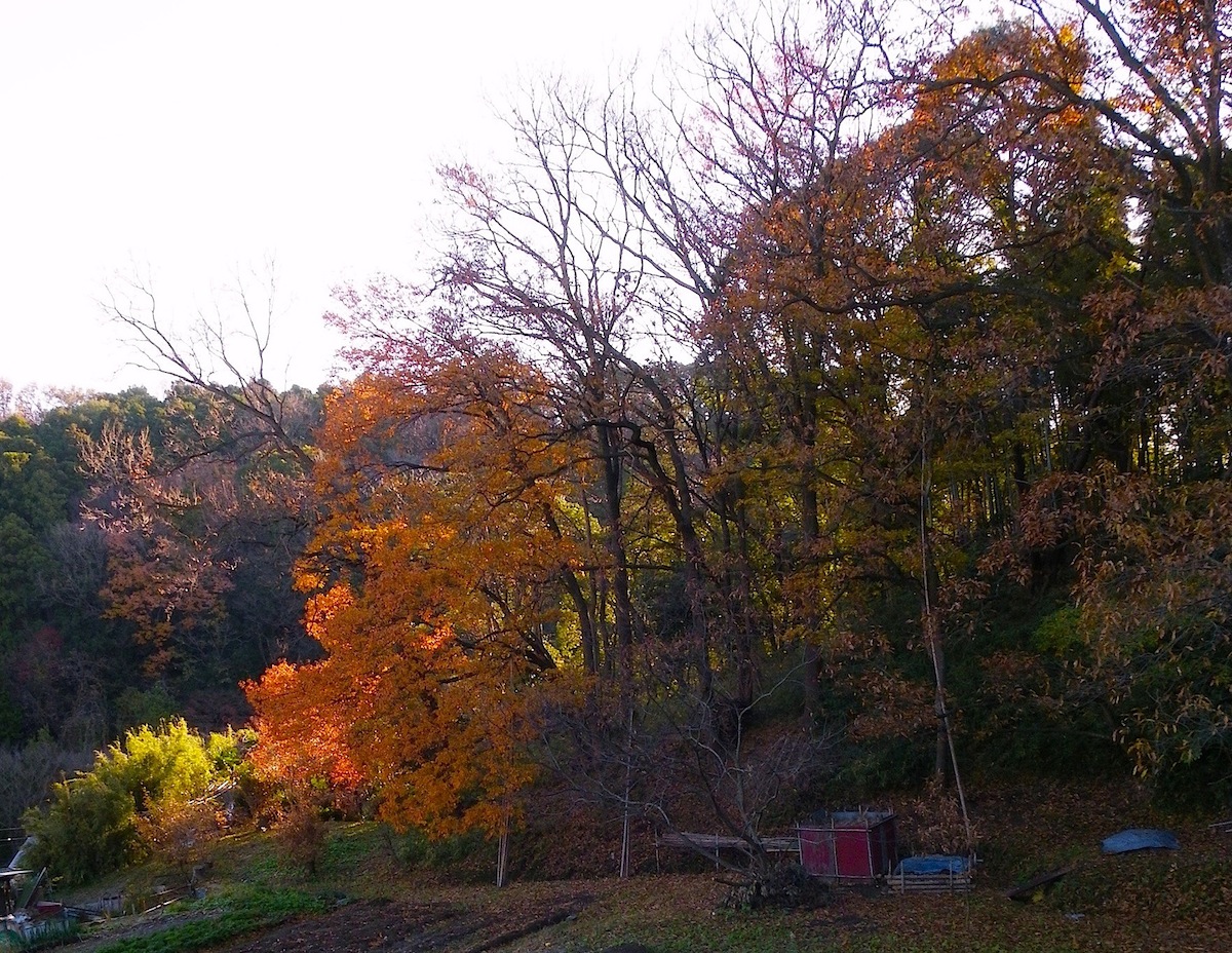 逆光の朝陽に輝くと、枯葉も花のにぎわい。