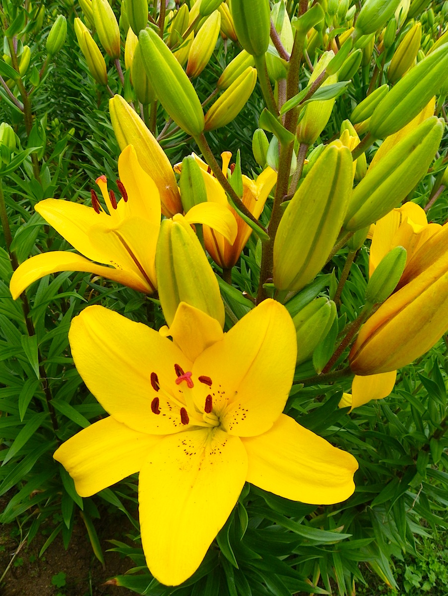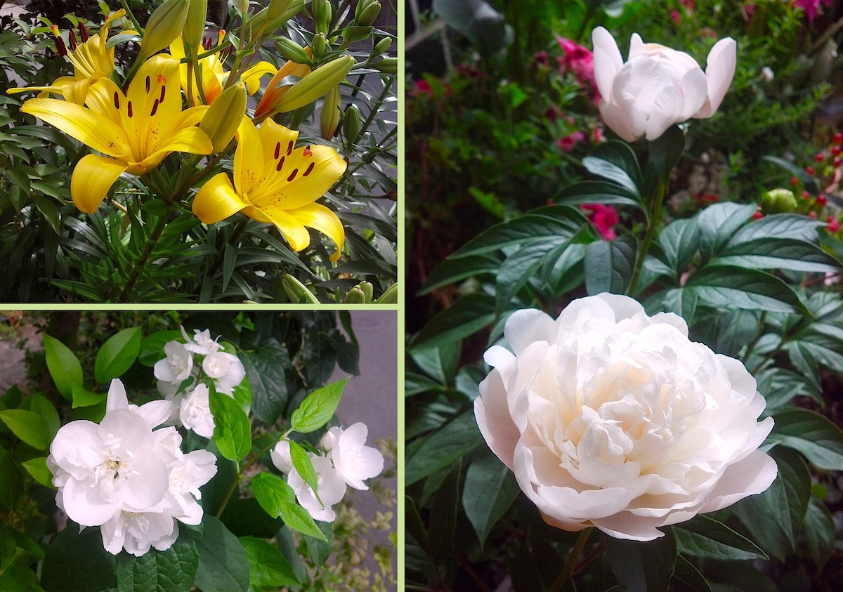 左上:黄色で草丈の高い大きなスカシユリも一斉に開花。これから色々な種類の百合が咲き競い、梅雨空に鬱ぐ気持ちを慰めてくれます。