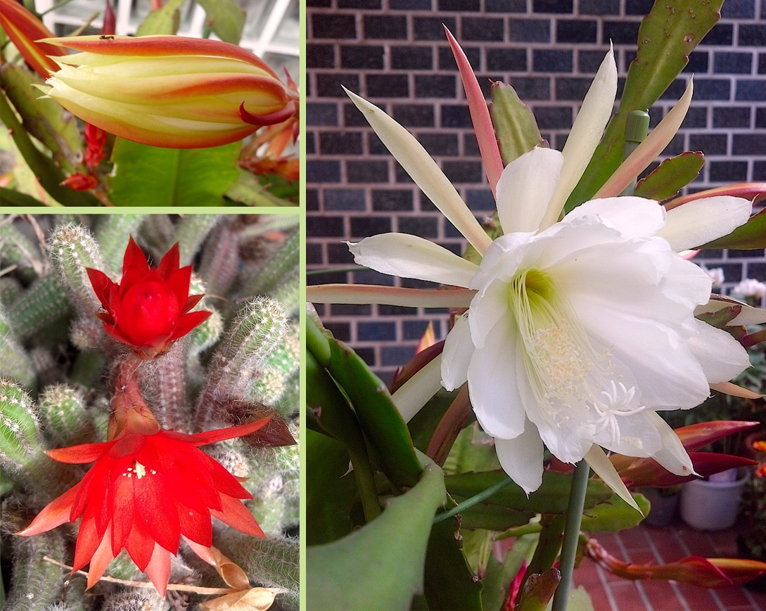 左上:昨朝のクジャクサボテンのつぼみ。もう開くゾという感じ。ウラン怪獣ガボラみたいですね。