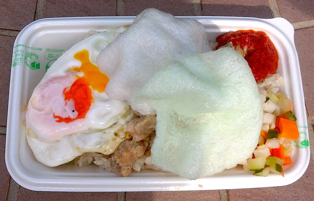 クルプック・ウダン(えびせんべい)で隠れてるけど、出来立ての鶏肉炒めとサンバル(チリソース)をいっぱいのっけてもらっちゃいました。